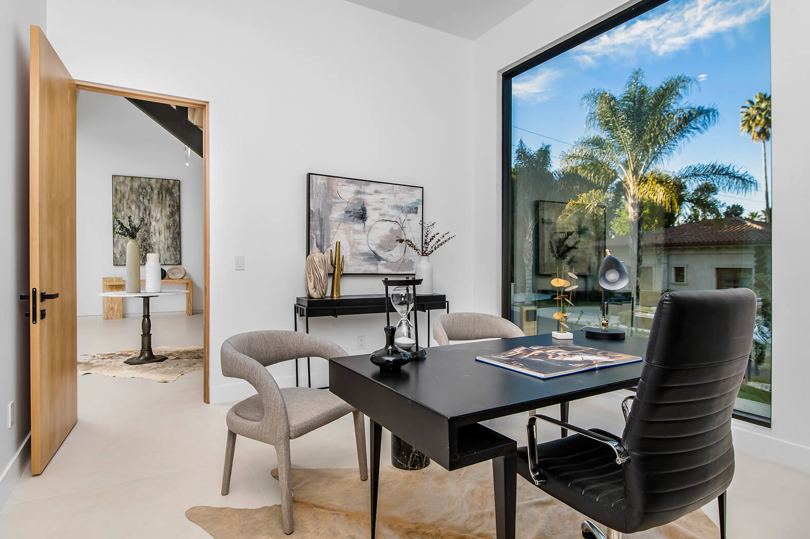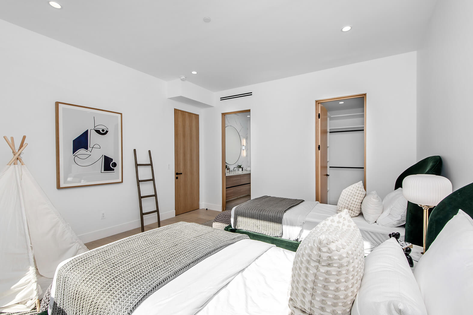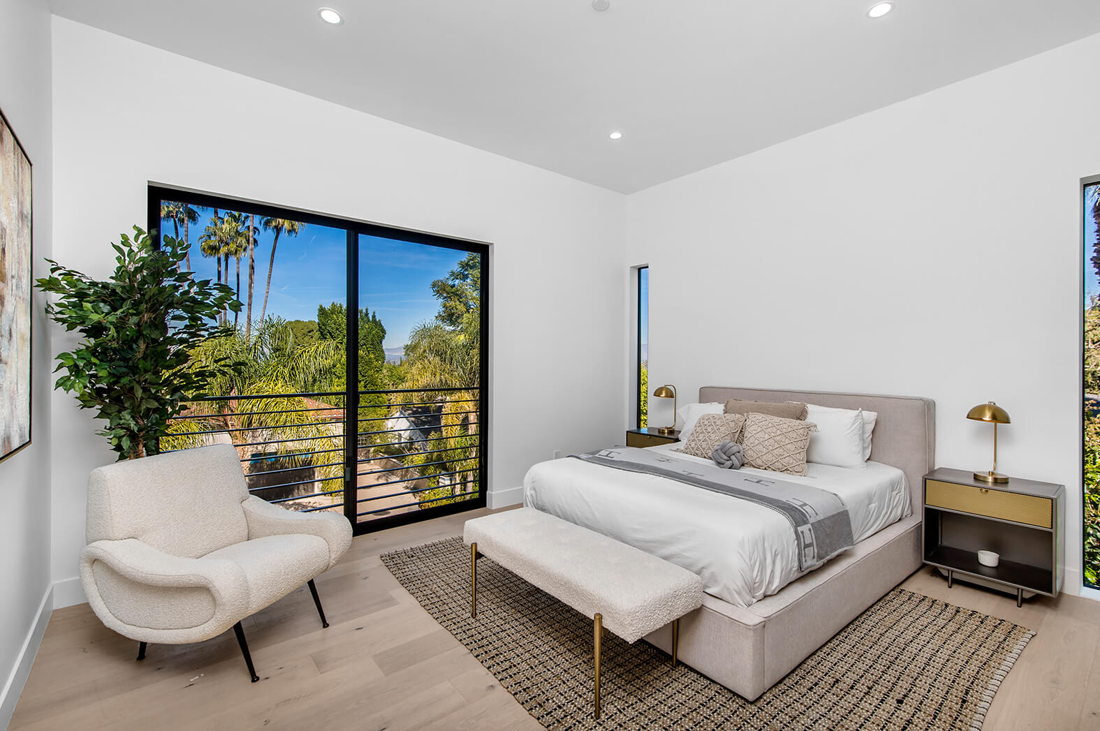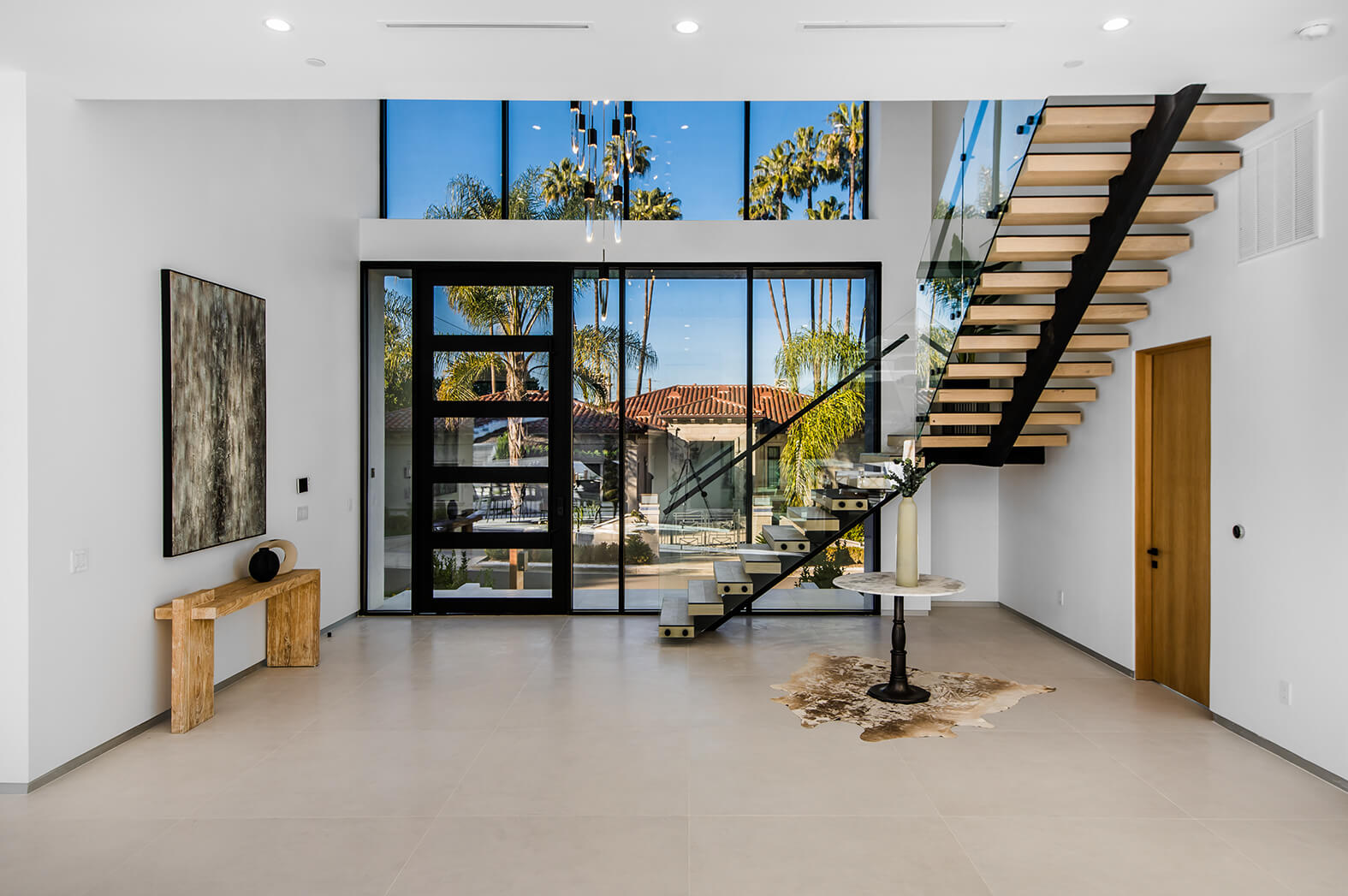 A warm, and modern design that features 12’ tall windows all around to create that close connection to the outdoors and bring in the natural sunlight, all day long. The 20’ pocket doors in the kitchen/ main living area and the neutral color of the tile flooring that continues seamlessly to the outside patio, create a perfect indoor-outdoor living experience. The open staircase, oak wooden wrapped steps, and glass railing design connect the first floor to the second where oak hardwood flooring continues and bring the necessary coziness to the bedroom spaces.