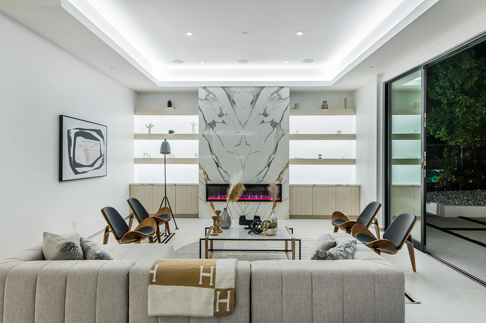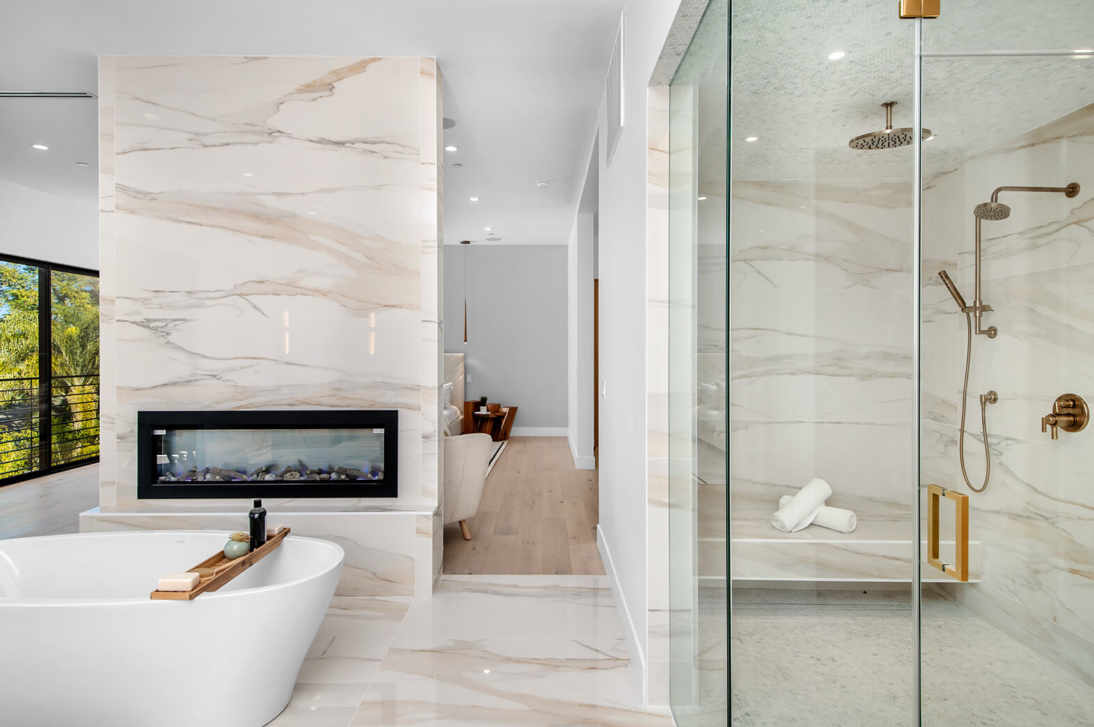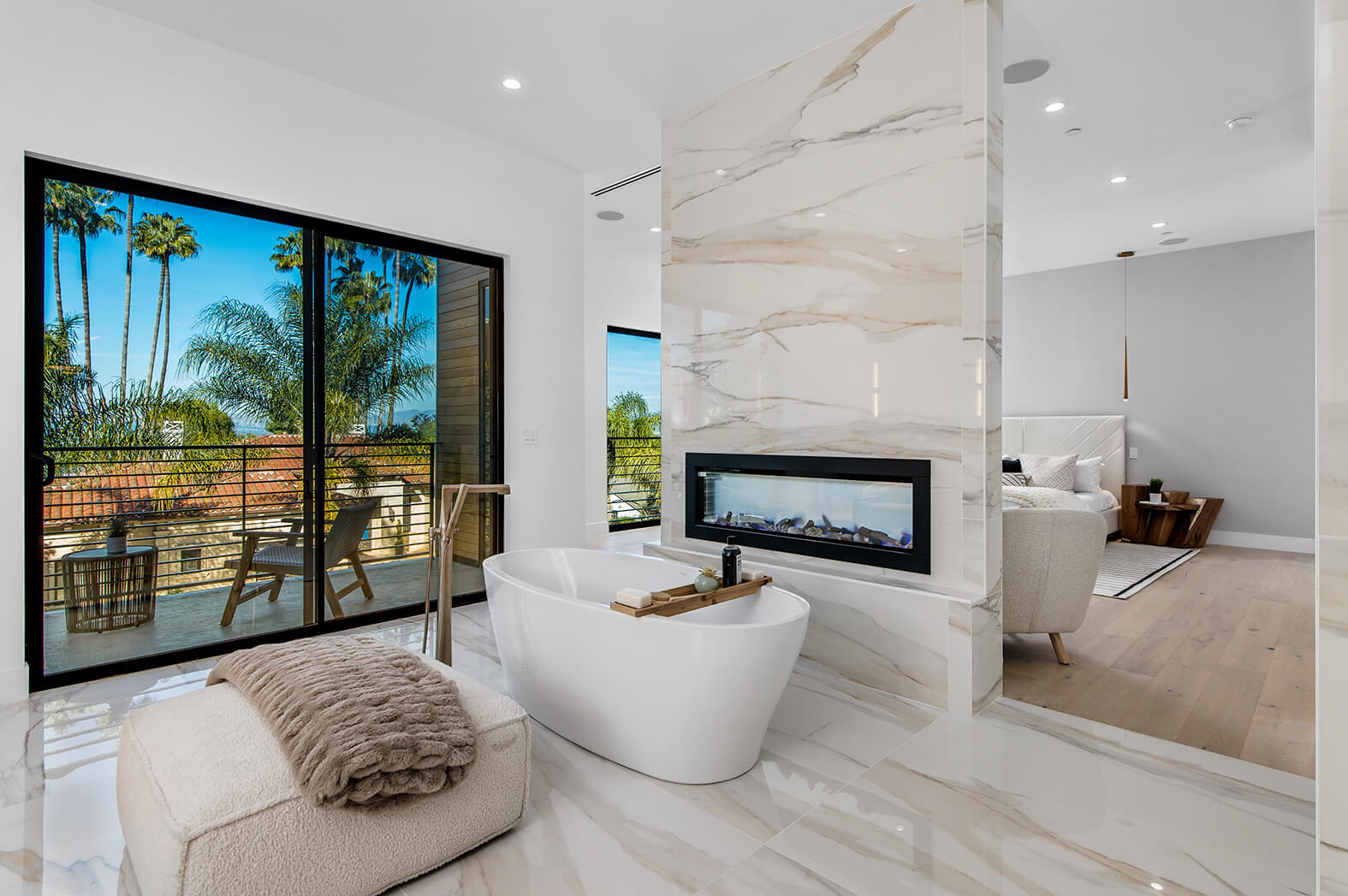 The vast high ceilings and LED cove lighting bring a warm and relaxing ambiance to the vast interior setting. A spa-like experience brings the master bedroom with open access to the en-suite bathroom. This area of the home features a two-sided fireplace visible both from the master bath and bedroom.