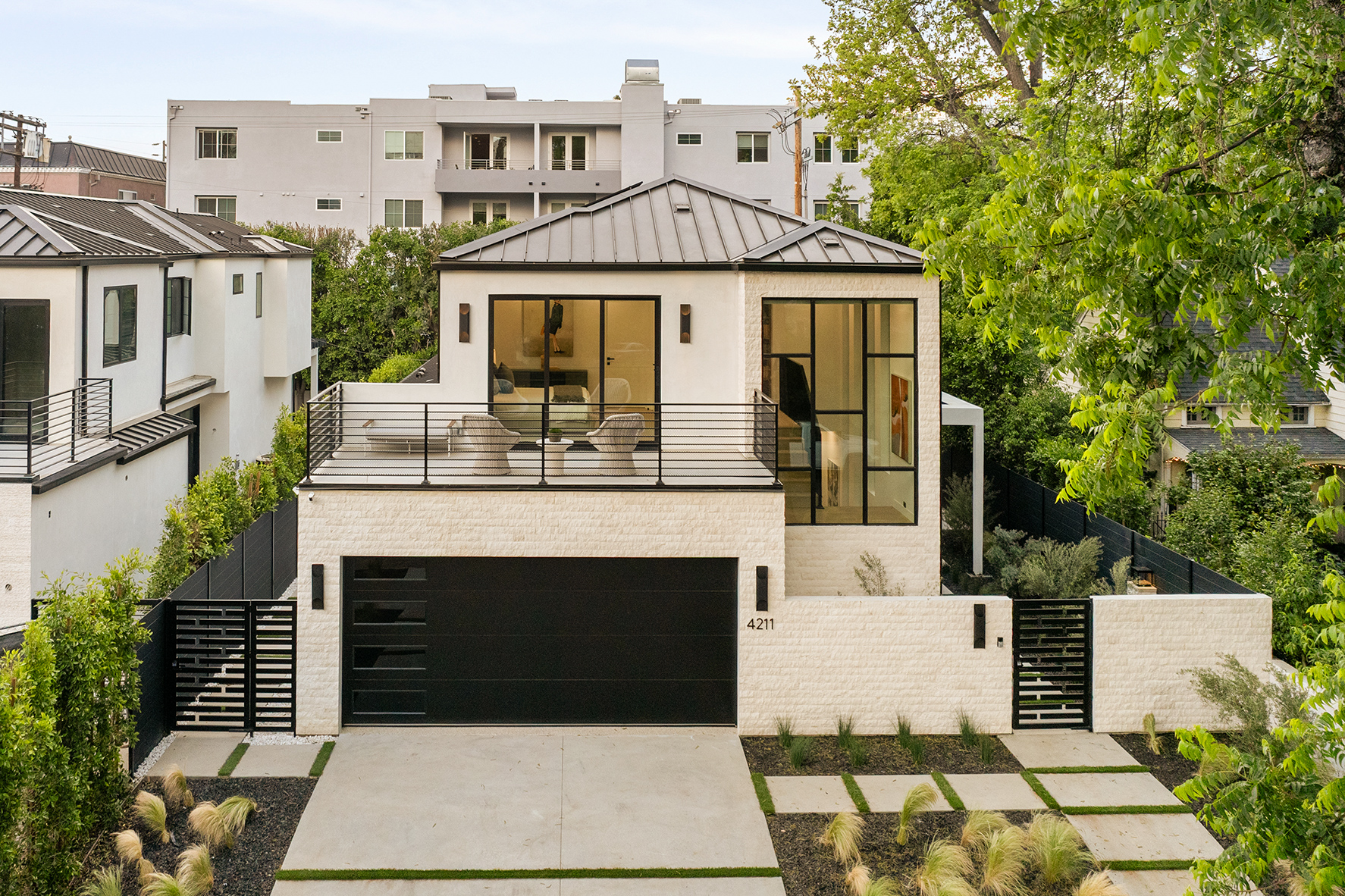 The façade blends modern minimalism with timeless materials — light stone, stucco, and black steel framed windows — creating a sleek yet inviting street presence.