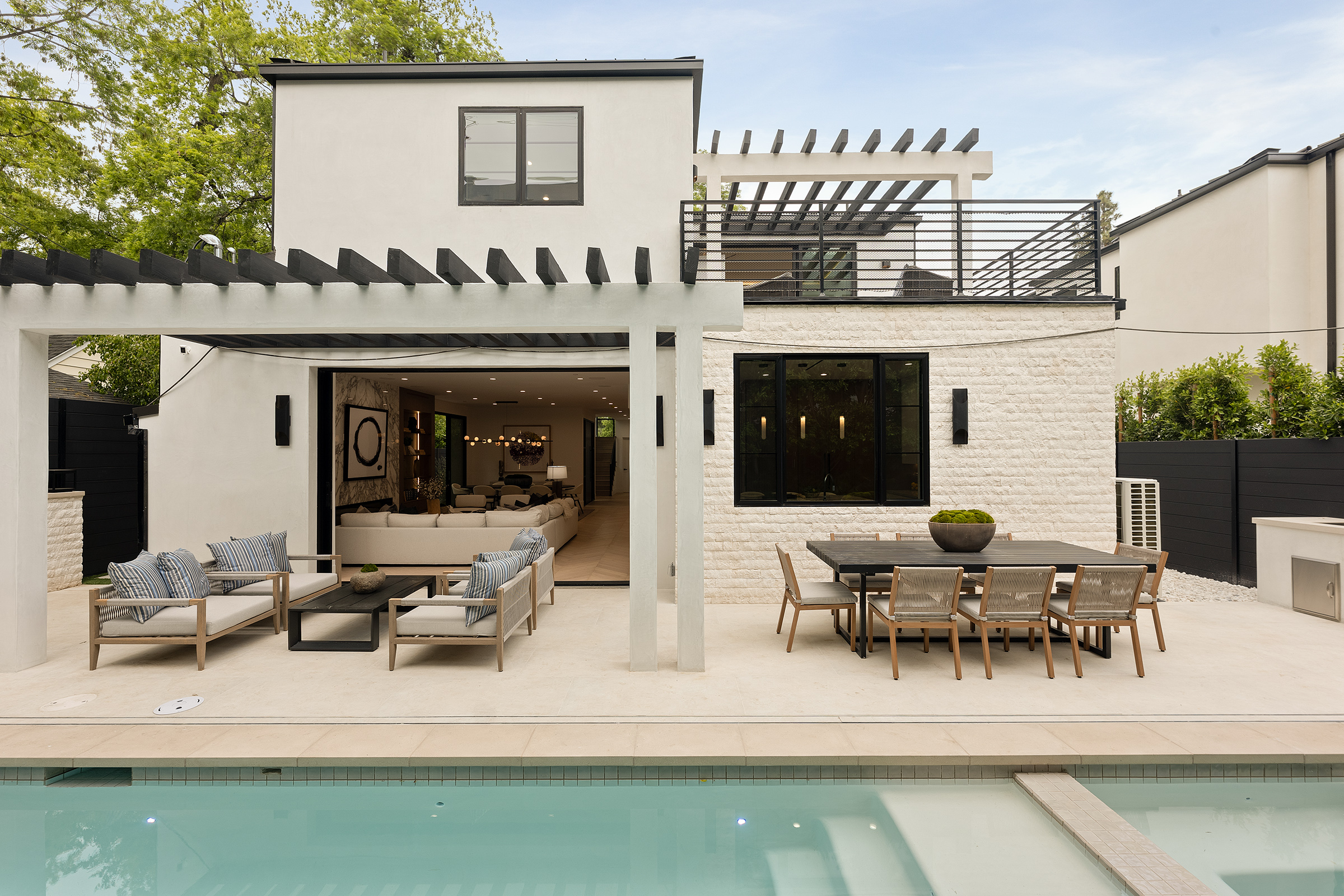 The backyard serves as a private resort — complete with a pristine pool, integrated spa, and custom pergola for shaded dining and lounging.