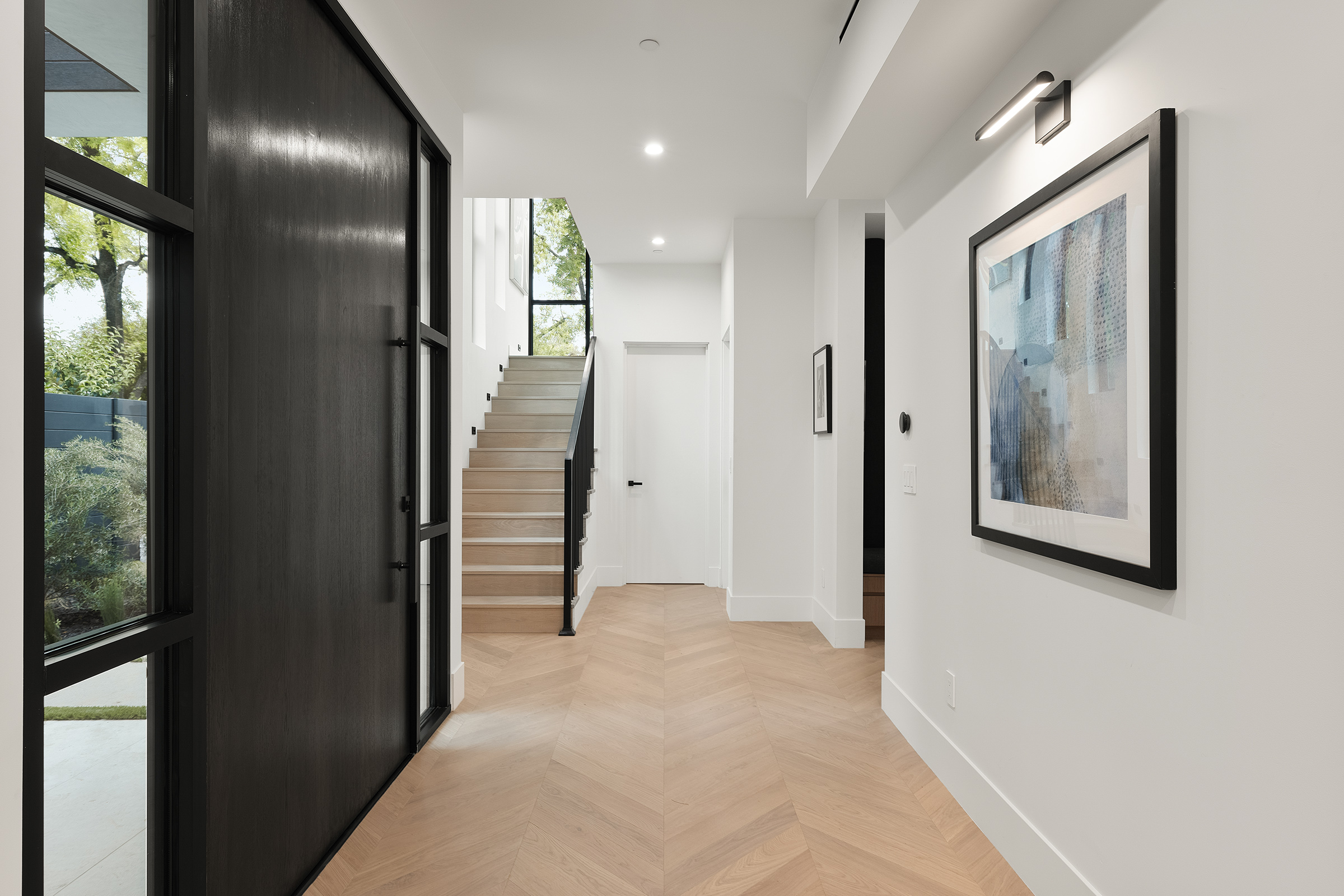 A sculptural staircase, custom millwork, and curated art pieces bring texture and personality to each transition zone.